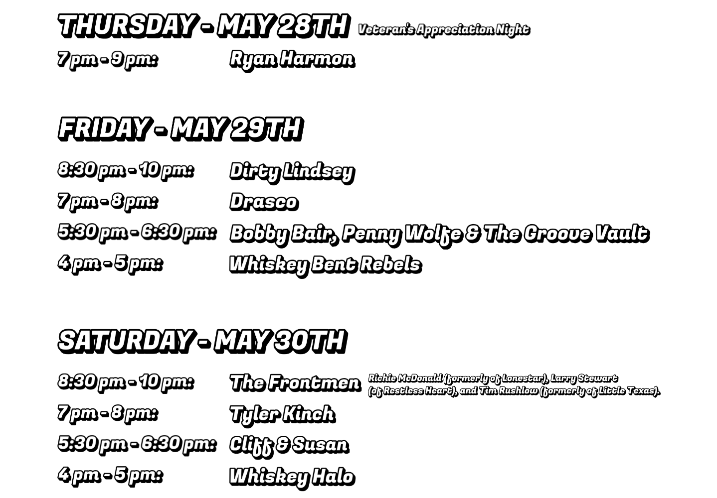 Richie McDonald (formerly of Lonestar), Larry Stewart (of Restless Heart), and Tim Rushlow (formerly of Little Texas).